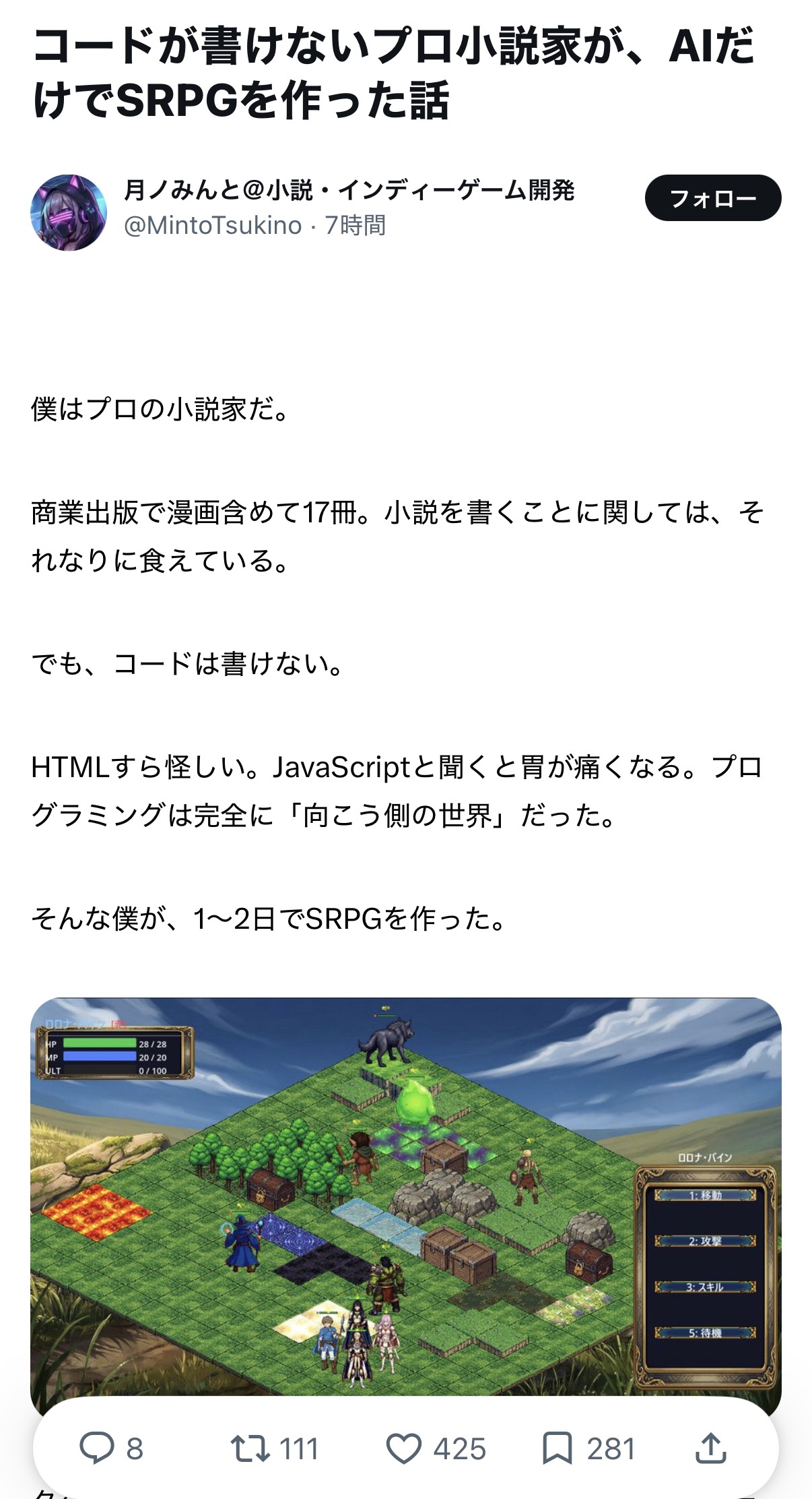 | … | 46326/03/07(土)19:45:56No.1408555455+>noteはプログラミングできない僕がAIとゲーム作ってみた日記だらけで笑う |