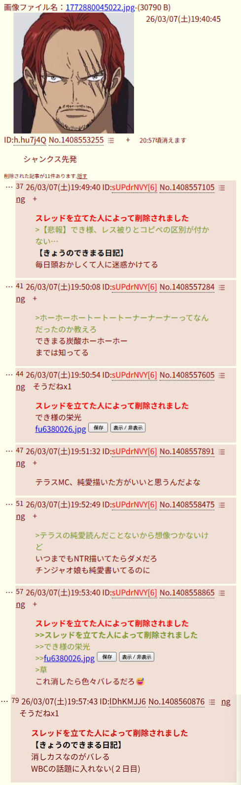 | … | 126/03/07(土)19:41:40No.1408553666+シャンクス中継ぎ |