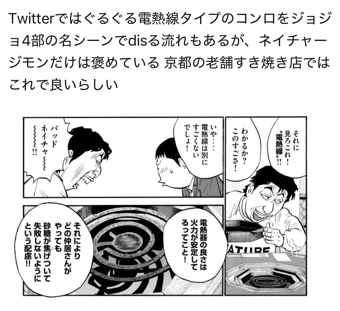 実は電熱線コンロのことはimgで康一くんの台詞引用して叩いてるのしか知らないんだよな俺