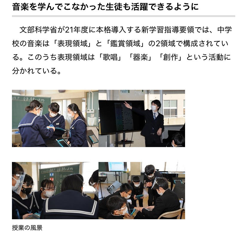 > 坂井教諭によれば、生徒からは「これまでの授業に比べ、創作に取り組みやすくなった」といった声が上がったという。従来の音楽の授業と違い、ピアノを習っている生徒や吹奏楽部の生徒だけが活躍するのではなく、これまで音楽を学んでこなかった生徒が良い作品を作り、友人から称賛される出来事もあったとしている。