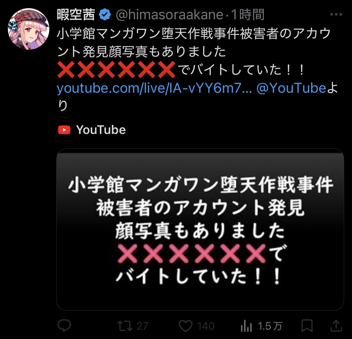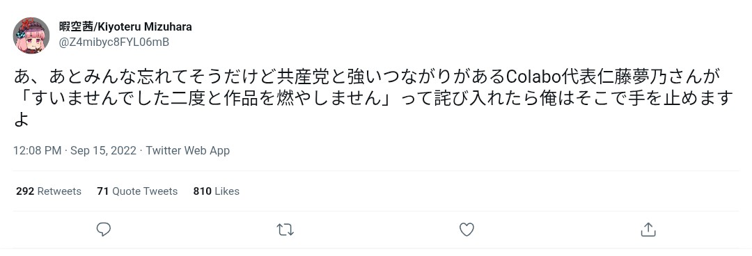 | … | 4926/03/08(日)00:57:40No.1408686026そうだねx5>>小学館を表現の自由の為に守る!とか言ってたのは見たけどなんで被害者晒してるんだよ |