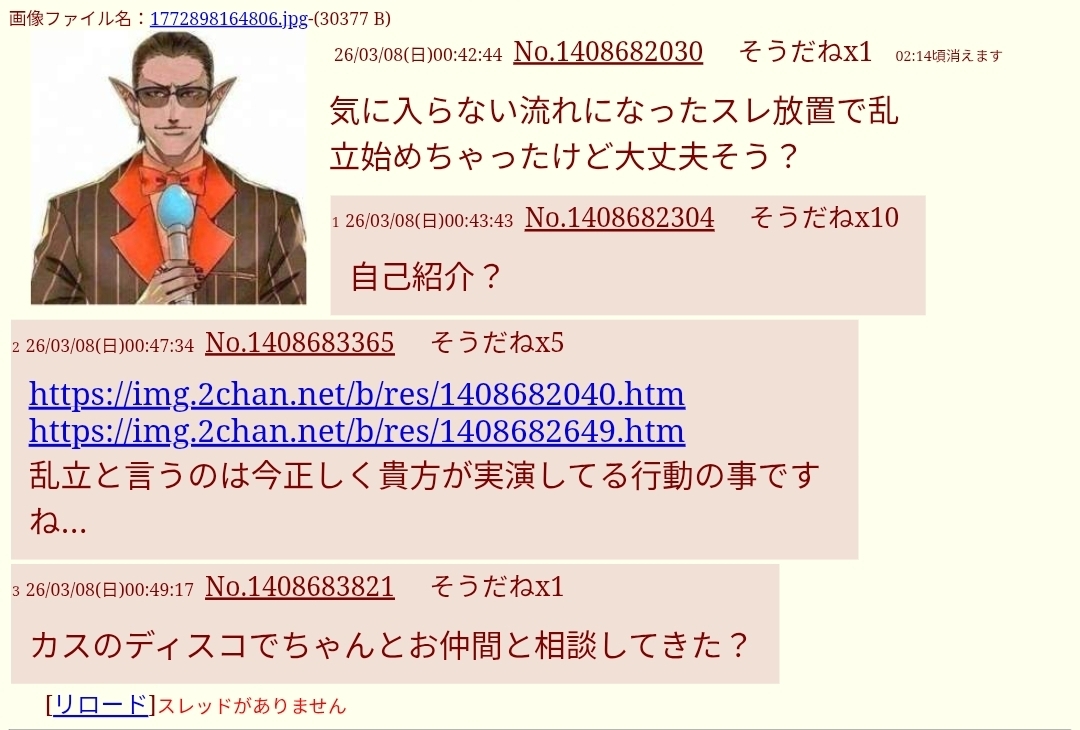 | … | 226/03/08(日)00:49:10No.1408683790+うわー荒らされちゃったわ困るなぁ |