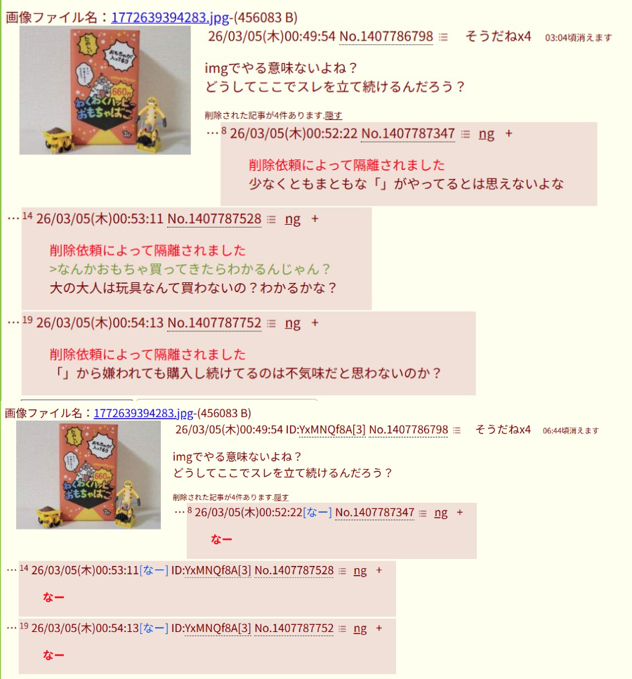 | … | 626/03/08(日)01:43:55 ID:c0LbSym6No.1408699171+削除依頼によって隔離されました |