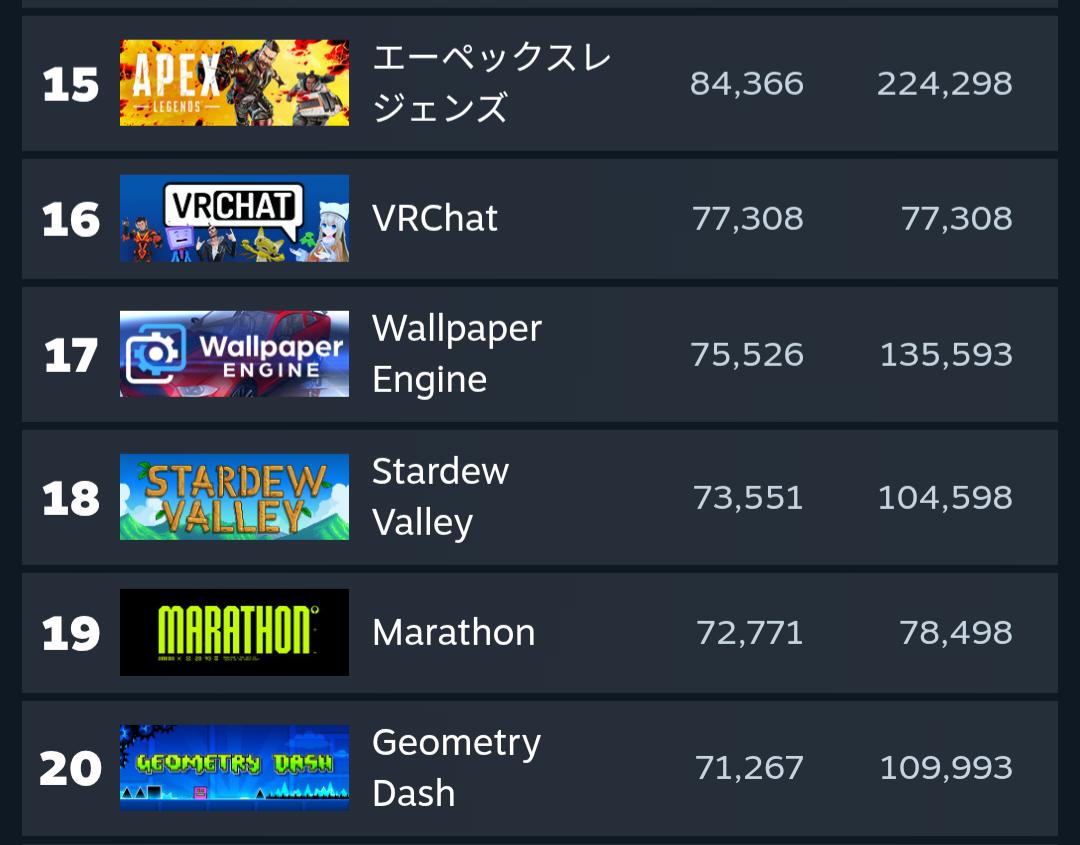 | … | 6526/03/08(日)12:12:52No.1408788397+>Steamチャートの数字は上の97000人と概ね整合するけど |