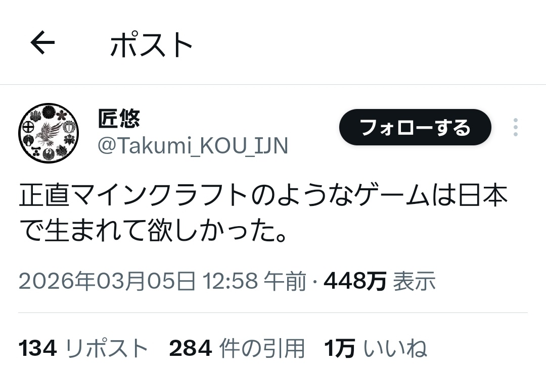 | … | 226/03/08(日)15:01:32 ID:qOEKnvCQNo.1408835194そうだねx24この板ですら未だにマイクラの何が面白いのかわからないって書き込みにいいねが大量につくからね |