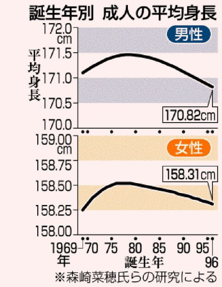 | … | 7626/03/08(日)16:44:44No.1408861433+>>80年がピークで成人の平均身長だからこっから下がるって事は1960年生まれが成人した頃から下がり初めるんだから貧困どうこうとかは全部的外れ |