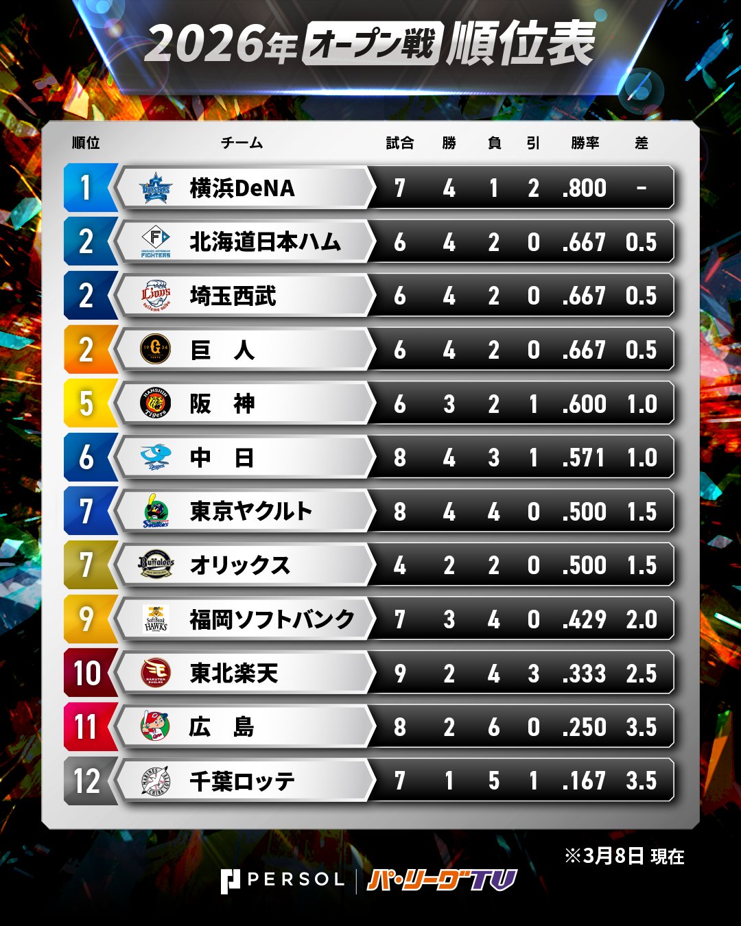 | … | 13426/03/08(日)17:31:41No.1408874291+2024年は2勝9敗だったけど3位だしオープン戦の順位は気にしても仕方ないんですよ…! |