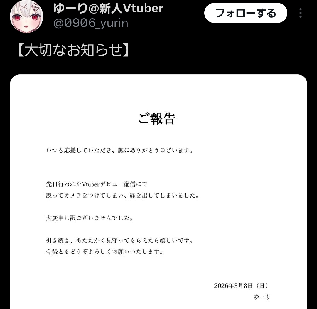 | … | 2026/03/08(日)16:14:53No.1408854532+見た感じ元々顔出してる歌い手がV体デビューしますって感じだな |