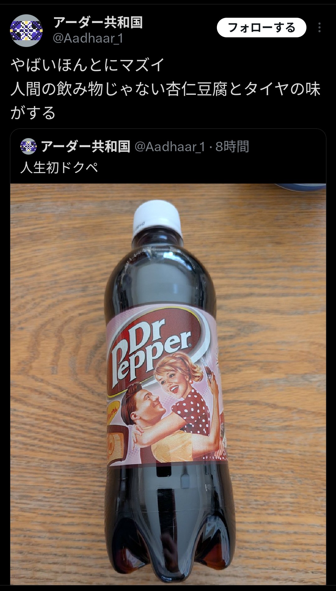 | … | 19726/03/08(日)20:51:36No.1408944949+ドクペを不味いと思ったことないからこの手の感想がよくわからない |