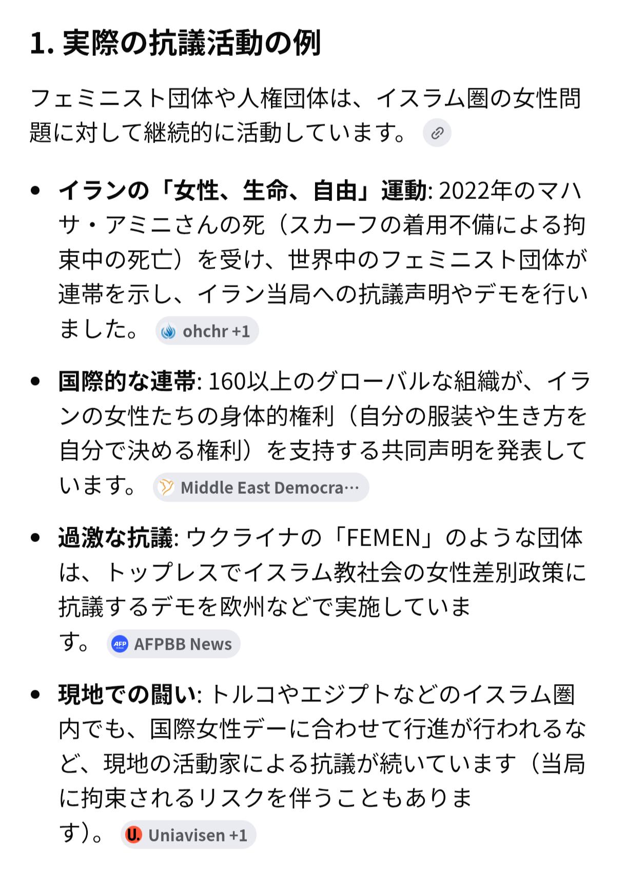 | … | 5426/03/09(月)00:03:13No.1409013506そうだねx2>そんな内政干渉って叫んでた奴もいるかもしれないけどフェミニストの人達が抗議してたって内容は具体的にはどんなの?そんな昔から活動してたの知ってるなら一つくらい出てくるよね? |