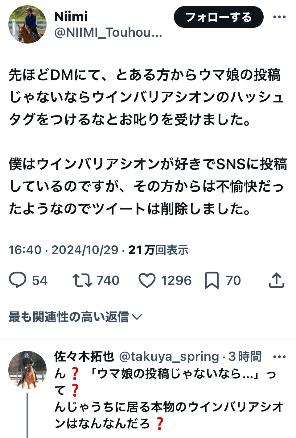 | … | 16426/03/09(月)19:08:19No.1409181520そうだねx1大多数のオタクは個々のウマ娘を推しているのであってウマ娘プリティーダービー及び競馬というコンテンツを推しているわけではないのだ |