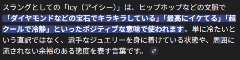 | … | 2626/03/09(月)22:25:42No.1409264992+まずicyが氷みたいな透明感あるみたいな意味だからぴったりだ |