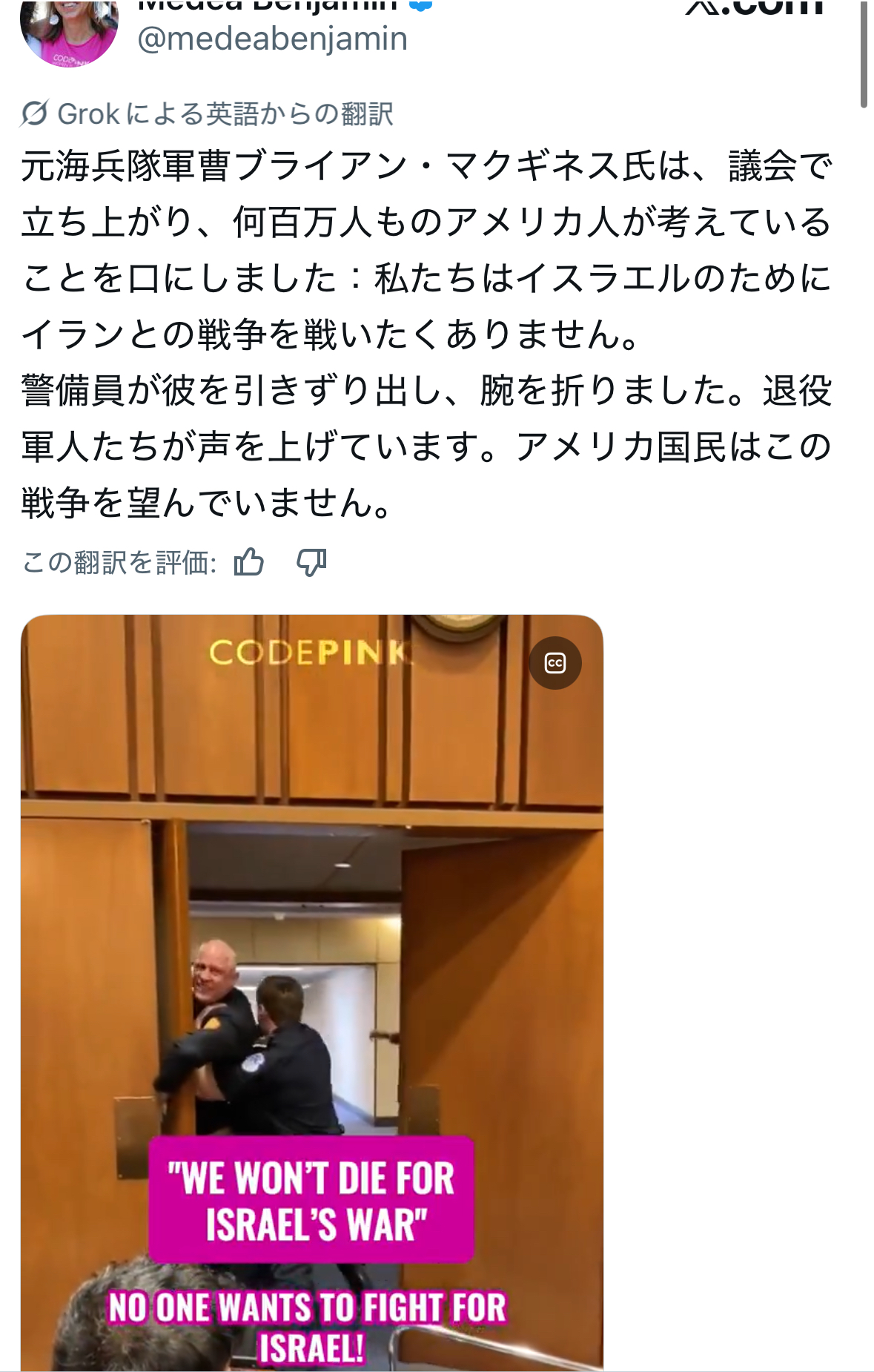 | … | 37926/03/10(火)00:17:49No.1409305522そうだねx2>>公聴会に呼ばれた元軍人が我が国民の兵士が何でイスラエルのために死ななきゃいけないんだ!!ってブチギレて退出命令くらって引きずり出されてたな |