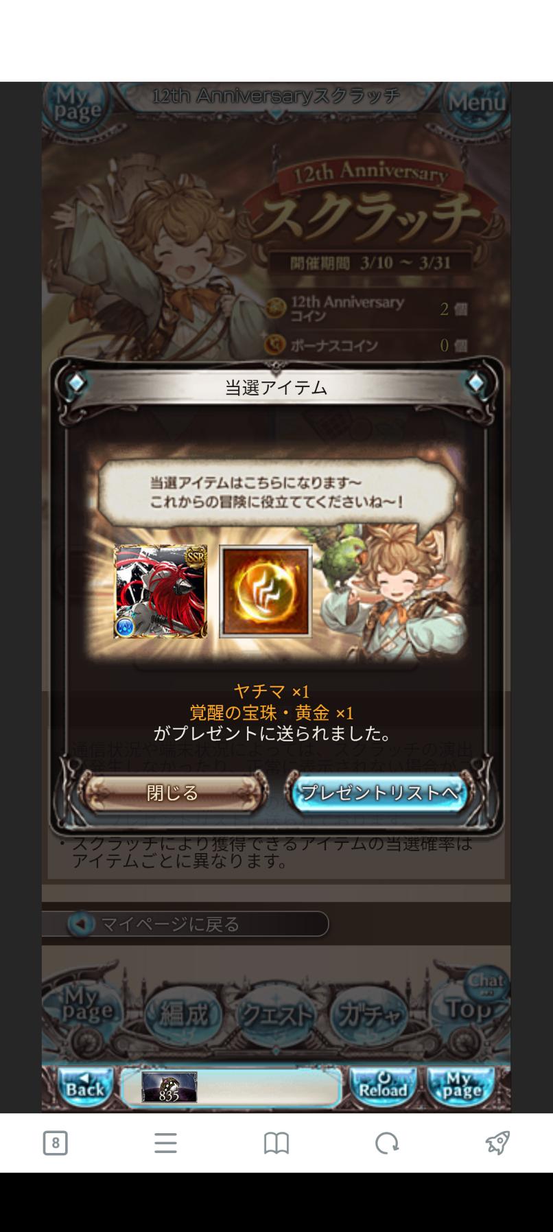 | … | 8526/03/10(火)00:04:24No.1409301629+スクラッチSSR確定チケが当たった |