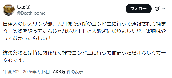 | … | 726/03/10(火)02:35:04No.1409328346そうだねx3そのあと別の部員が大麻使用疑いで書類送検されたらしい |