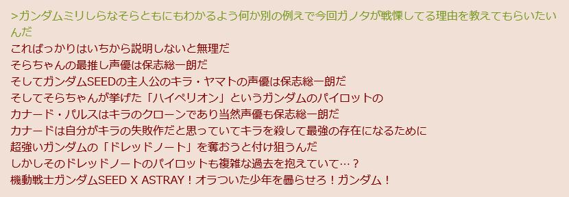 | … | 4426/03/10(火)09:05:12No.1409351139そうだねx2>だって右上既にしてガンダムの歌歌ってっし… |