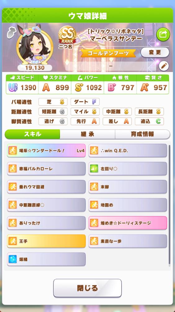 | … | 50426/03/10(火)12:15:15 ID:qQN1P3.cNo.1409381769+>気にしてなかったけどもいsかして服で適正が変わりますか? >マーちゃん二種あるんですが キャラによってAの位置変わったり温情で底上げされたりします たまに脚質も変わります |