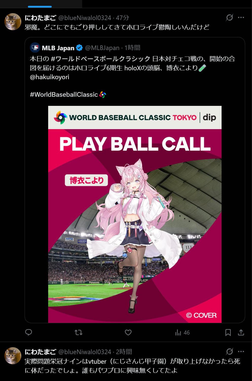 | … | 59826/03/10(火)17:48:51No.1409454692+>舞元がにじさんじにしては珍しくWBC同時視聴の許可貰ってきたんだからそっち応援してろよ |