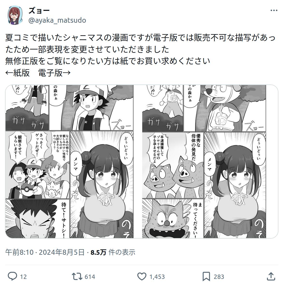 | … | 8526/03/10(火)19:09:59No.1409478064+ポケモンの二次創作はFANZAチェック通らないから仕方ないね |