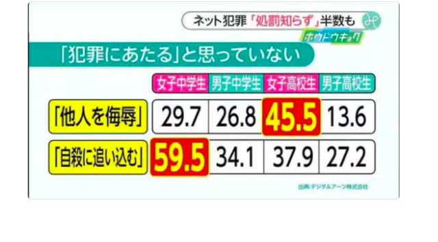 | … | 4426/03/10(火)20:21:17No.1409503038そうだねx1>自殺に追い込むが犯罪だと思ってないが約60%って… |