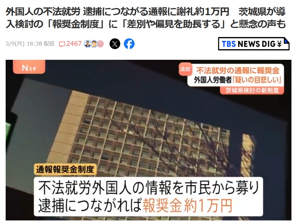 | … | 10126/03/10(火)23:18:48No.1409568281+>これ外国人個人じゃなく雇ってる事業者を通報する方式だぞ確か |