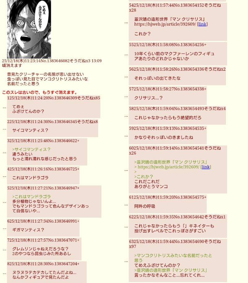 | … | 1226/03/11(水)07:02:45No.1409620258+人の蛹だからマンクリサリスというそのままなんだけどあまりにもマンコクリトリス |
