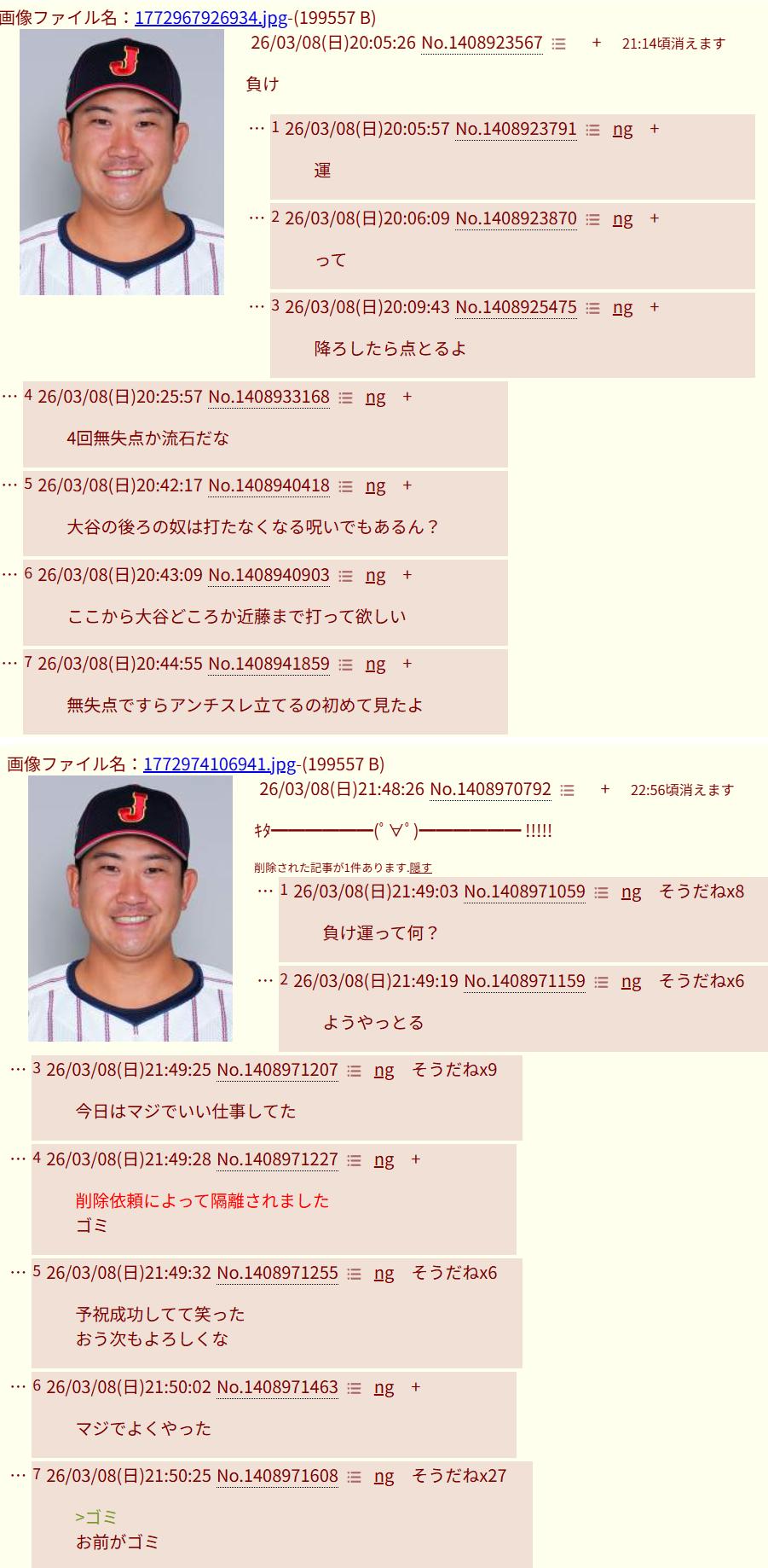 | … | 2726/03/11(水)09:46:21No.1409641774そうだねx11元々野球スレは酷いってだけでWBCで普段スレ見てない人が酷さに気付いただけでは? |