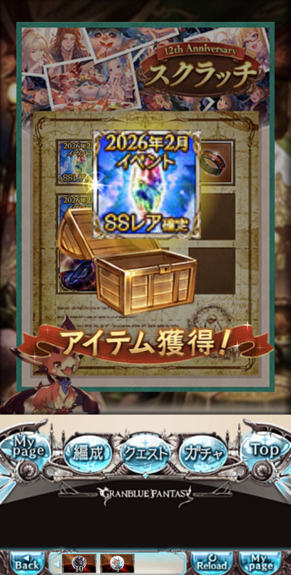 | … | 4326/03/11(水)11:41:53No.1409662499+スクラッチは石3000が2回出たしルーレットのおまけで黒い羽根5枚貰えたしで割ともう満足してきたんだよ |