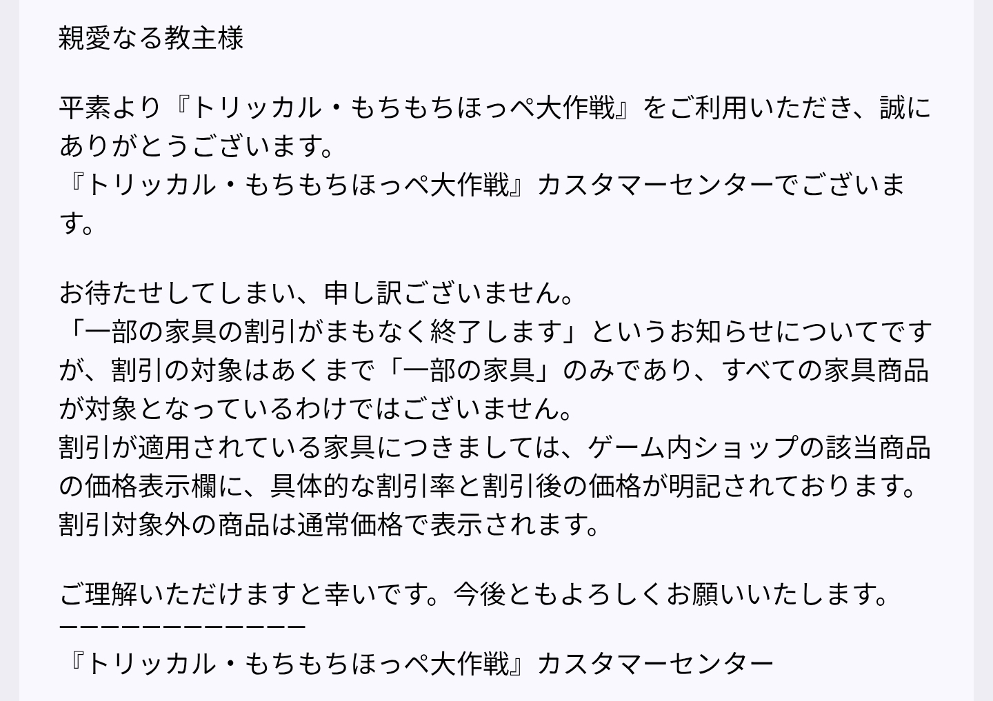 | … | 4326/03/11(水)15:47:11 ID:eIX.ssAANo.1409723118+割引終了に大型ギャラリーあるけど大型ギャラリー値引きしてなくね?って送ったの返ってきたにゃん |