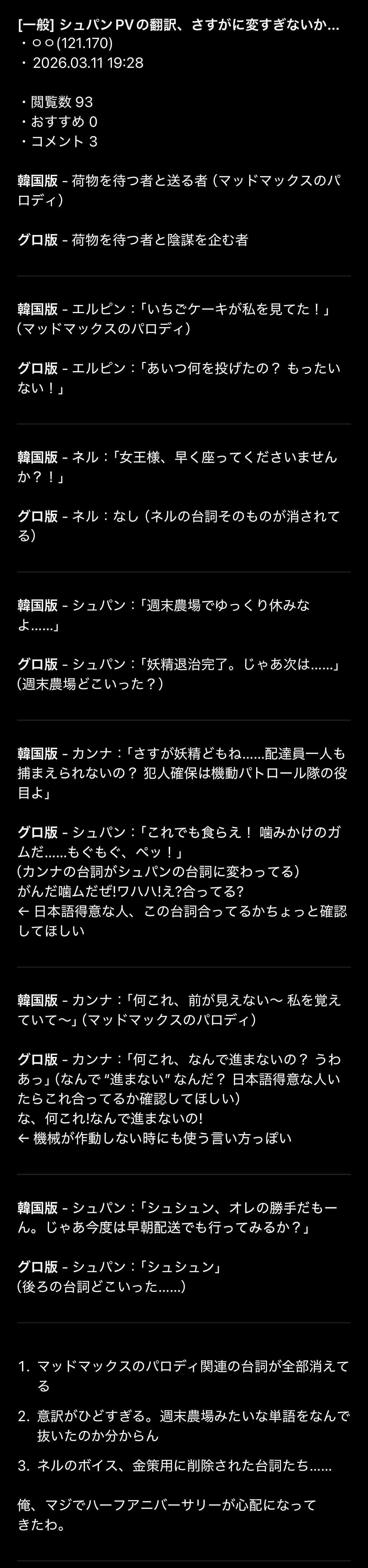 | … | 19326/03/11(水)20:28:50 ID:HboPpzDYNo.1409807815そうだねx1セリフの尺詰めるために「っ」とかの間まで切ってカタコトみたいになってるのがめちゃくちゃ言われてたから今回はセリフを抜くことで尺を合わせたんじゃないかな… |