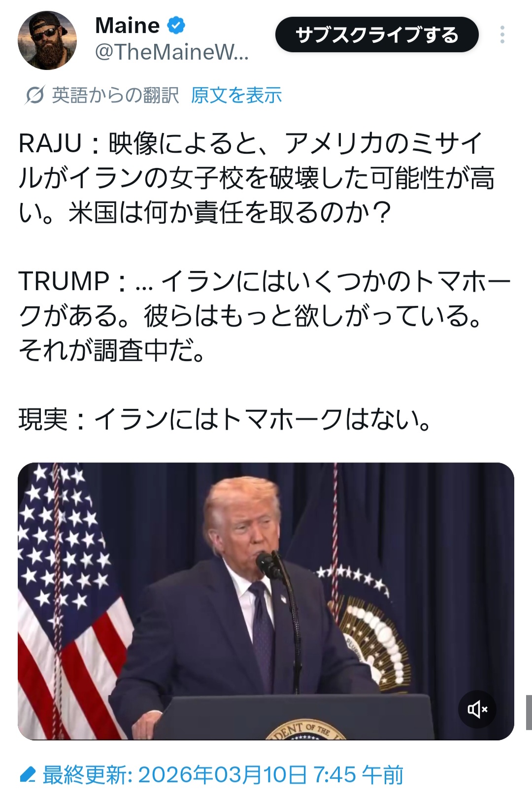 | … | 8026/03/11(水)21:33:46No.1409832790+イランの誤爆やろwとか言って誤魔化されるもんだと思ってた |