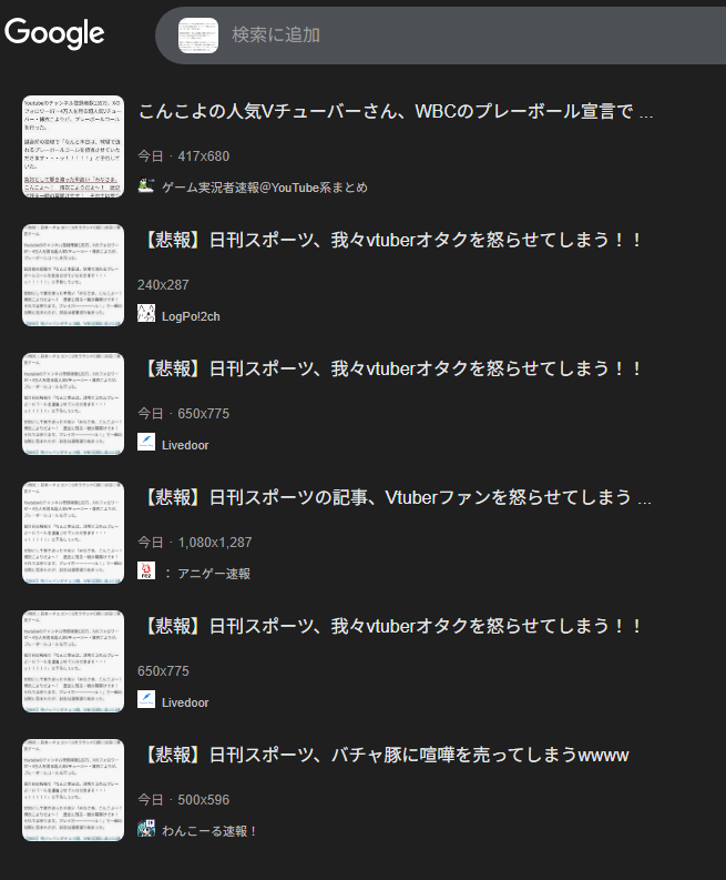 | … | 3426/03/11(水)22:51:27No.1409861758そうだねx13>日刊スポーツはホロ粘着 |