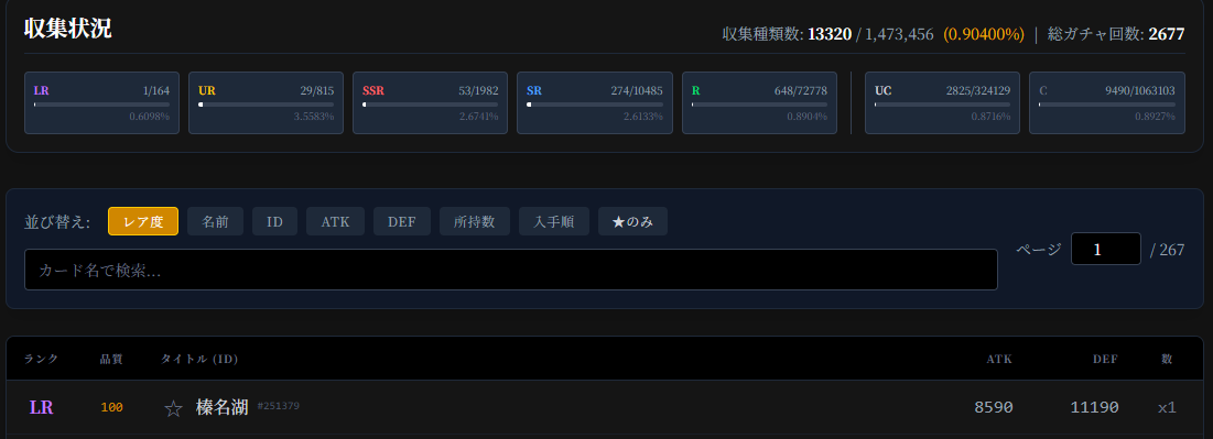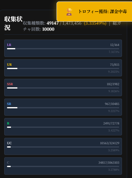 | … | 7026/03/12(木)01:39:20No.1409905533+レアリティ別収集状況みるとSR以上確定パックちゃんと機能してんだなって感動する |