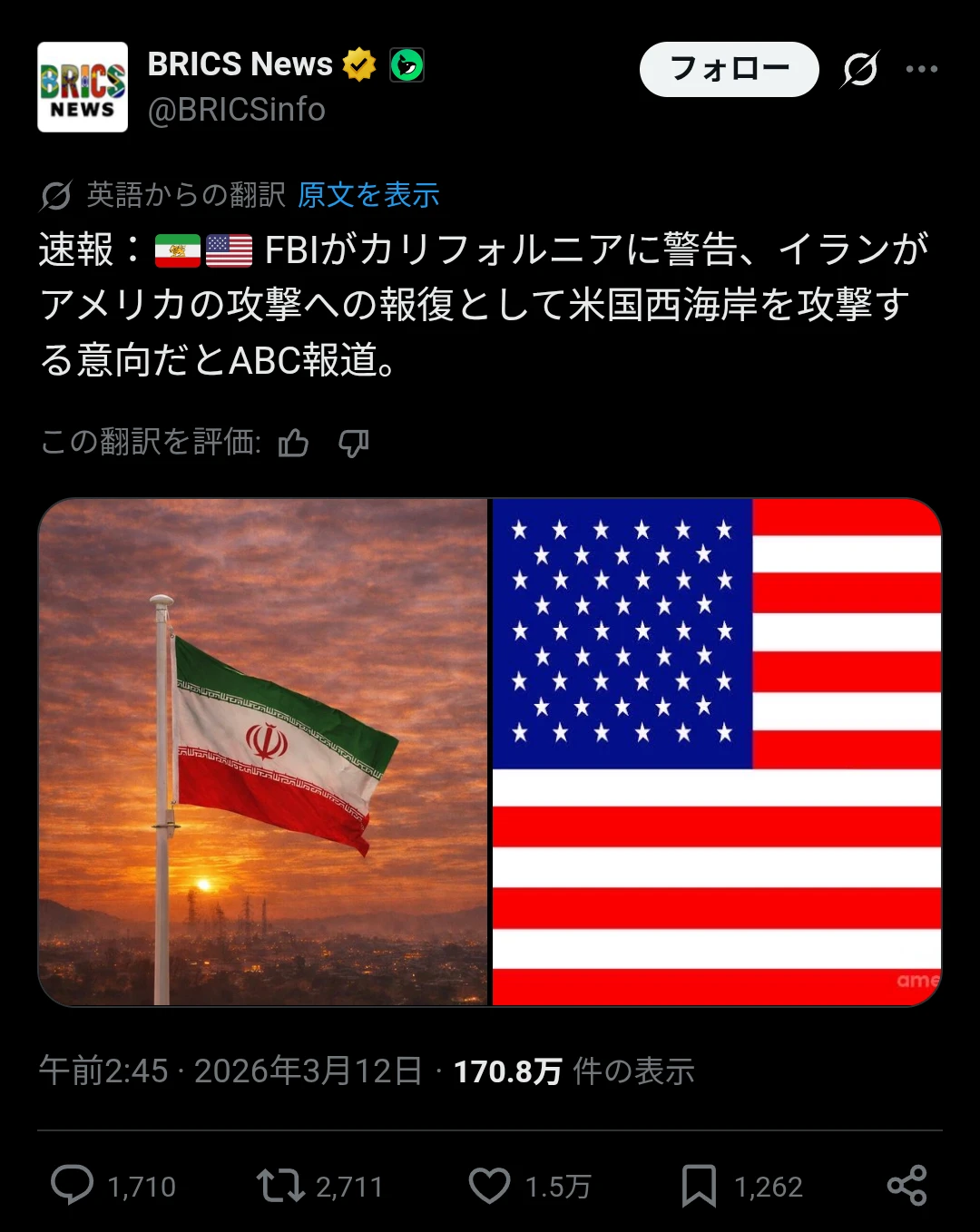 | … | 1926/03/12(木)07:19:16No.1409921519+>ABCニュースが入手した警告によると、FBIはこのほどカリフォルニア州の警察当局に対し、米国による攻撃への報復としてイランが西海岸に向けてドローンを発射する可能性があると警告した。 |