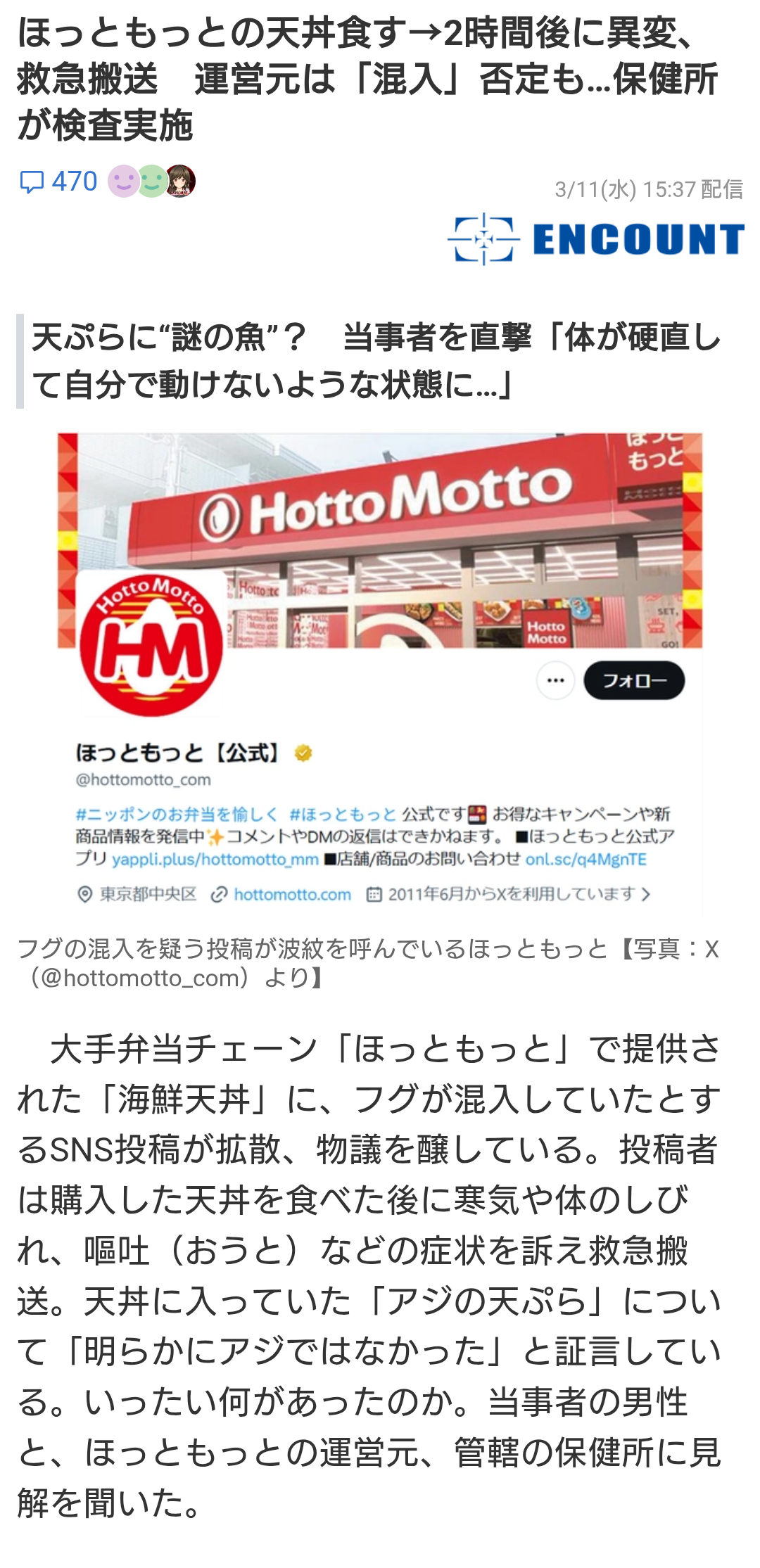 | … | 8026/03/12(木)13:42:48No.1410006871そうだねx3>ほっともっとからプレスリリース出てるけど保健所の検査でも問題無しだったってよ |