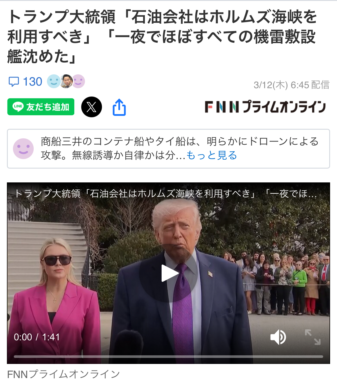| … | 2526/03/12(木)18:46:17No.1410081200そうだねx5>米海軍がガッツみせて護衛しろよ |