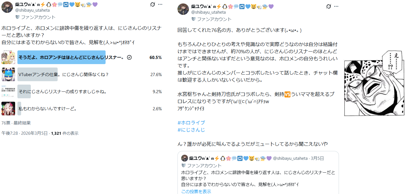 | … | 2026/03/12(木)20:50:09No.1410121988そうだねx3普通にSNSでもにじリスがホロ粘着してるって認知されたり |
