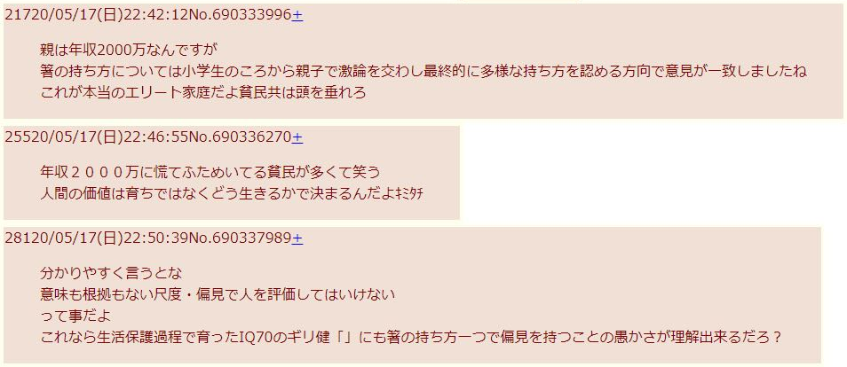 | … | 4226/03/12(木)21:13:45No.1410130875+人の前でメシ食う機会ありそうなお家なら箸の持ち方くらい教育してるだろ |