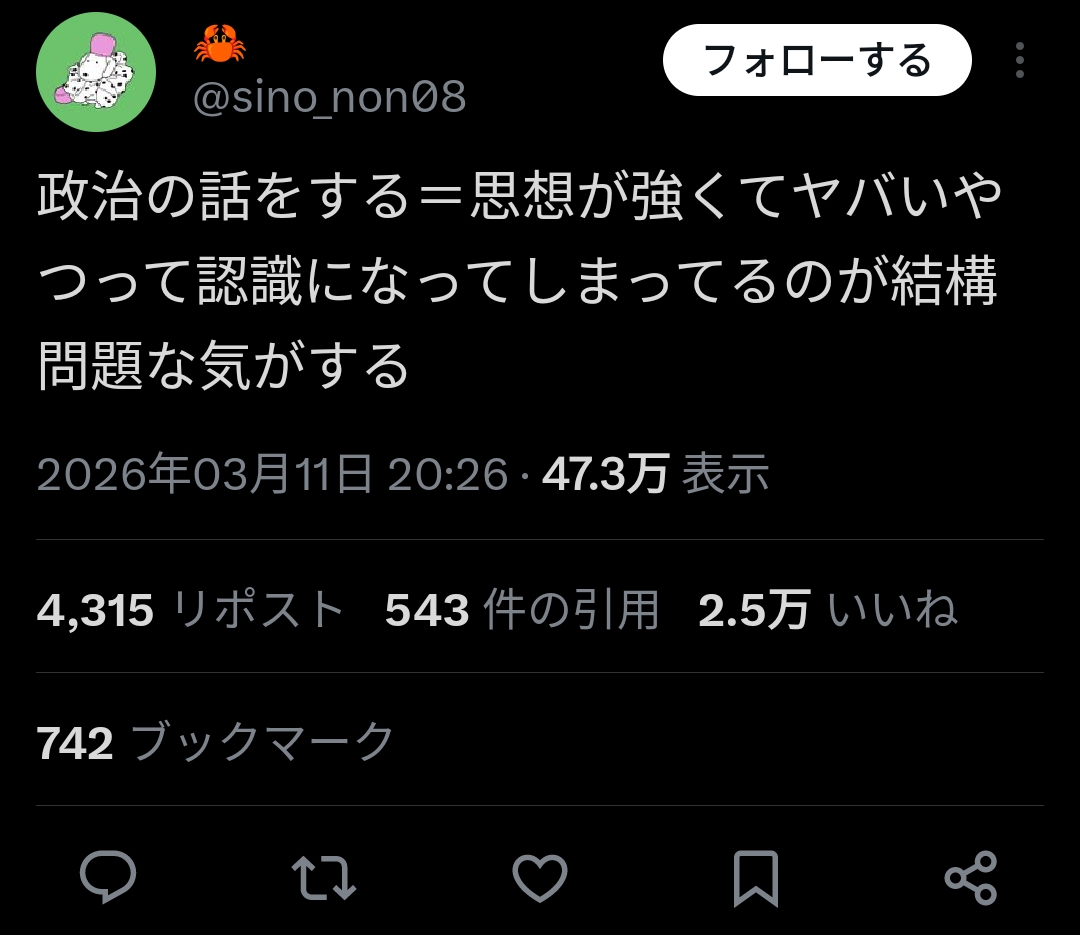 | … | 2726/03/12(木)22:13:19No.1410151228+そもそもSNSって政治語りに全然向いてない場じゃないですか |
