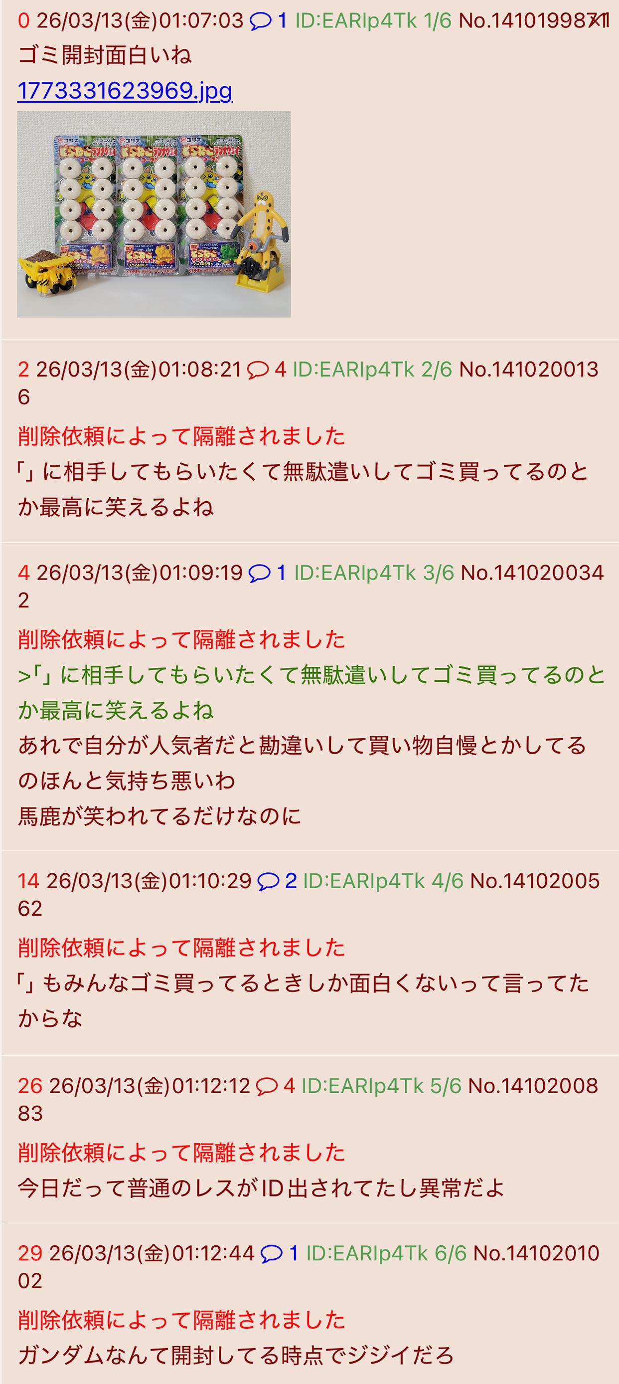 | … | 5626/03/13(金)01:24:55No.1410203093そうだねx2また色んな配信者のスレでうんこ垂れ流しながらコピペしてんじゃん |