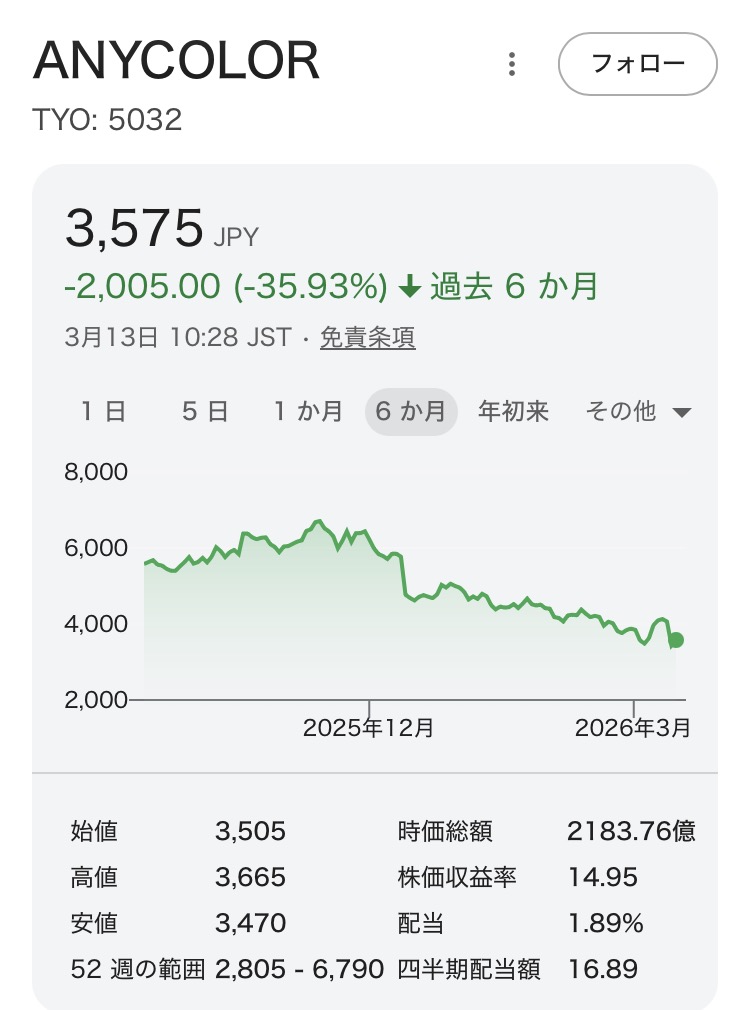 | … | 1226/03/13(金)10:57:07No.1410254616+>エ ニー カラーの値動きを見てると投機家はこの会社に何を期待していたんだろうと思ってしまう |