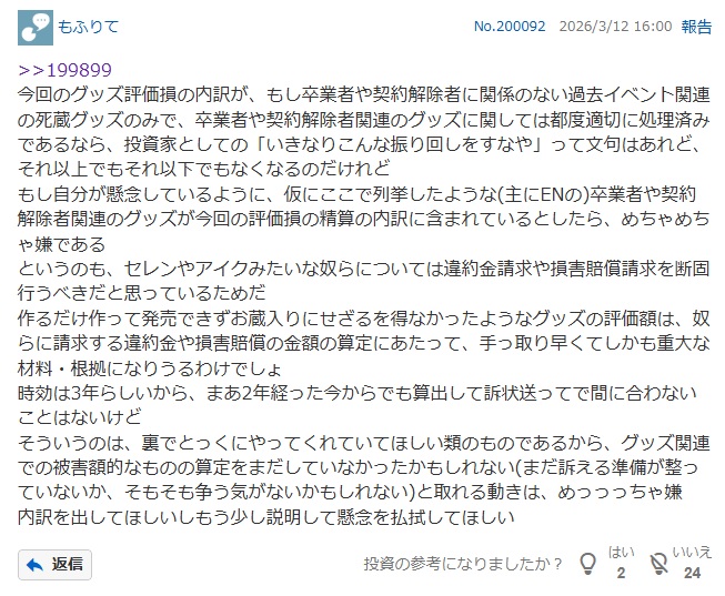 | … | 2826/03/13(金)11:02:11No.1410255462+>在庫管理費11億円も掛かり売れ残りのグッズ在庫52億円もある |
