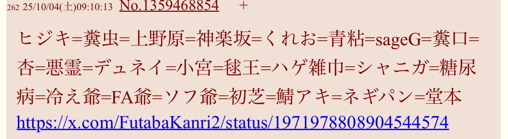 | … | 18826/03/13(金)13:30:39No.1410292594+スレ画みたいな名前羅列してこいつらを同一視してるお前らは統失!って主張するのはまだ自分の罪の誤魔化しの手段として理解するけど |