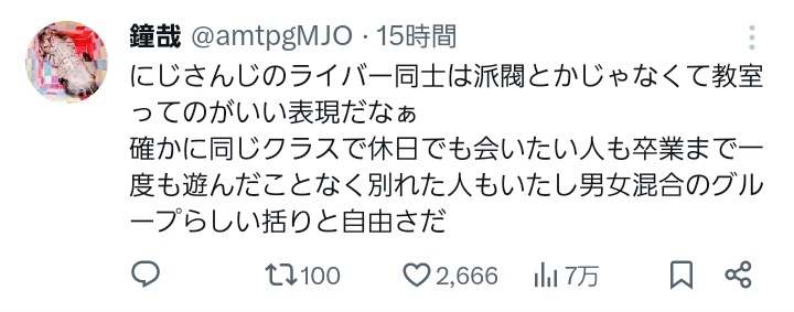 | … | 3526/03/13(金)11:55:08No.1410266493そうだねx6>オフで飯食ったり旅行したりつるんでる他所の演者は派閥 |