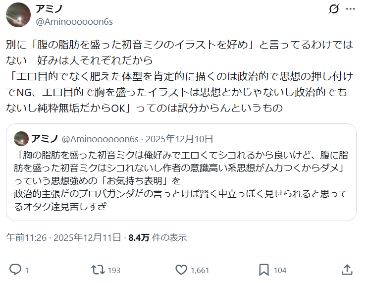 | … | 29626/03/13(金)16:45:50 ID:Wu/6zYIQNo.1410331427そうだねx1>エロの嗜好の差に勝手に政治的思想だの読み取って難癖に使うなって話だろ |