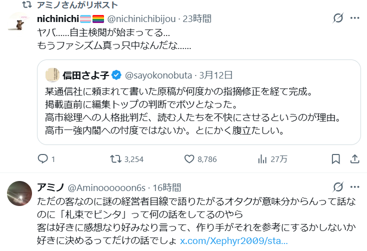 | … | 26826/03/13(金)16:25:33No.1410327263+否定意見が叩かれるのは当然だって言うまではともかく |