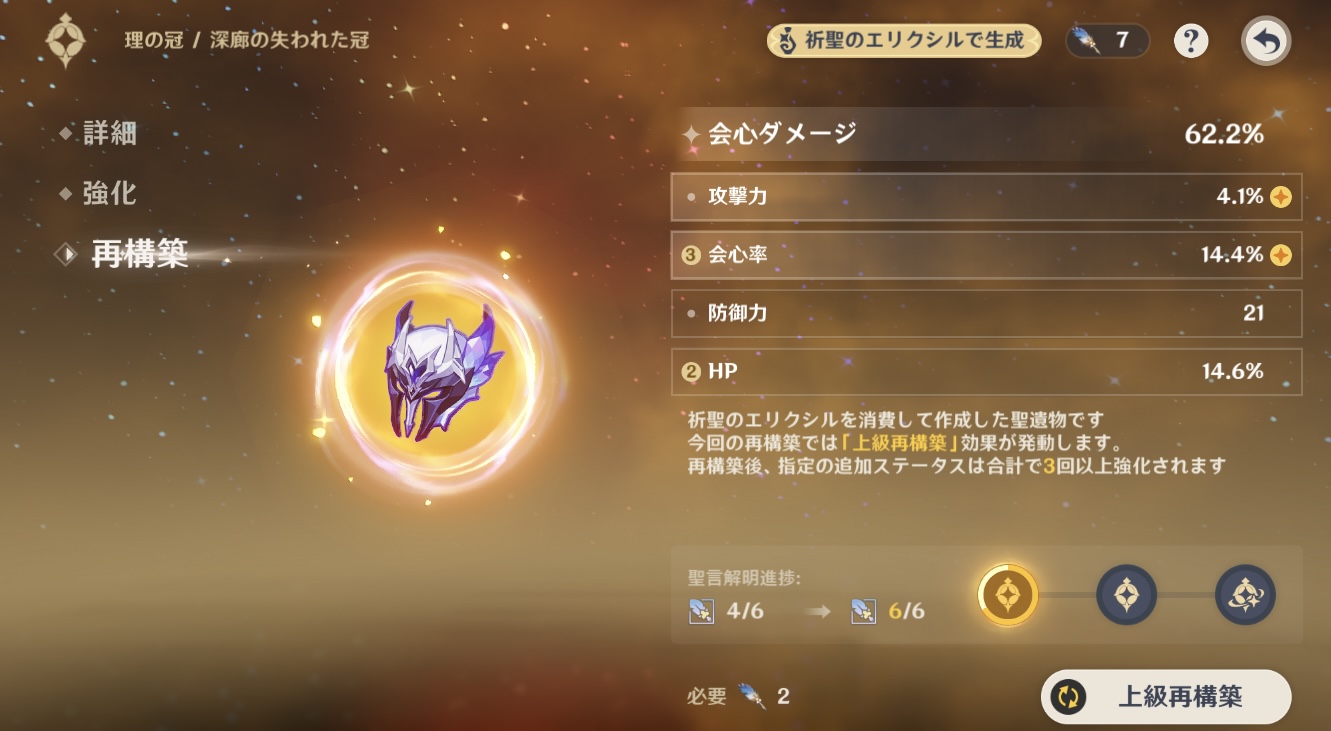 | … | 2926/03/13(金)23:00:27No.1410453968+アルティメットクリアするだけなら汁産使ってキャラ凸ればいいけど聖遺物厳選ってそういう領域超えてるよなぁ… |