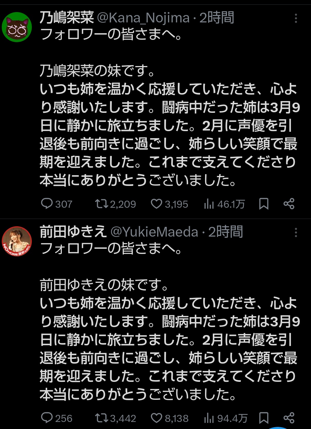 | … | 8026/03/14(土)13:07:02No.1410581476+両名義で同時に訃報出すのそりゃそうせざるを得ないでしょうけども |