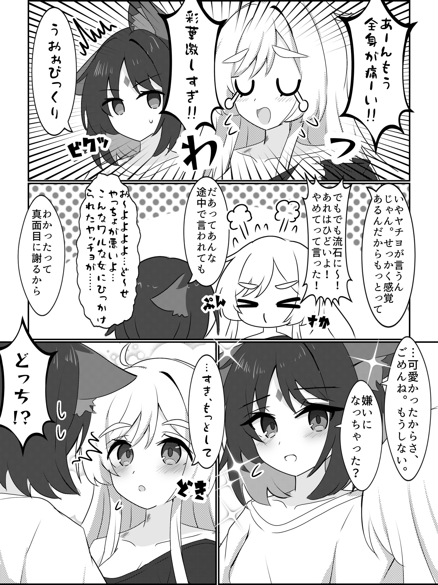 | … | 1026/03/14(土)15:08:02No.1410615050そうだねx5>トラウマとか抜きにちょっと寂しくなった彩葉がぬっと現れて後ろからかぐやを抱きしめる日常の一コマくらいはあっていい 🐰わぁっどしたの彩葉!? 🦊んー…なんでもない。ちょっとこうさせてて 🐰いやかぐやは別にいいけどその…配信中だよ? 🦊えっ |