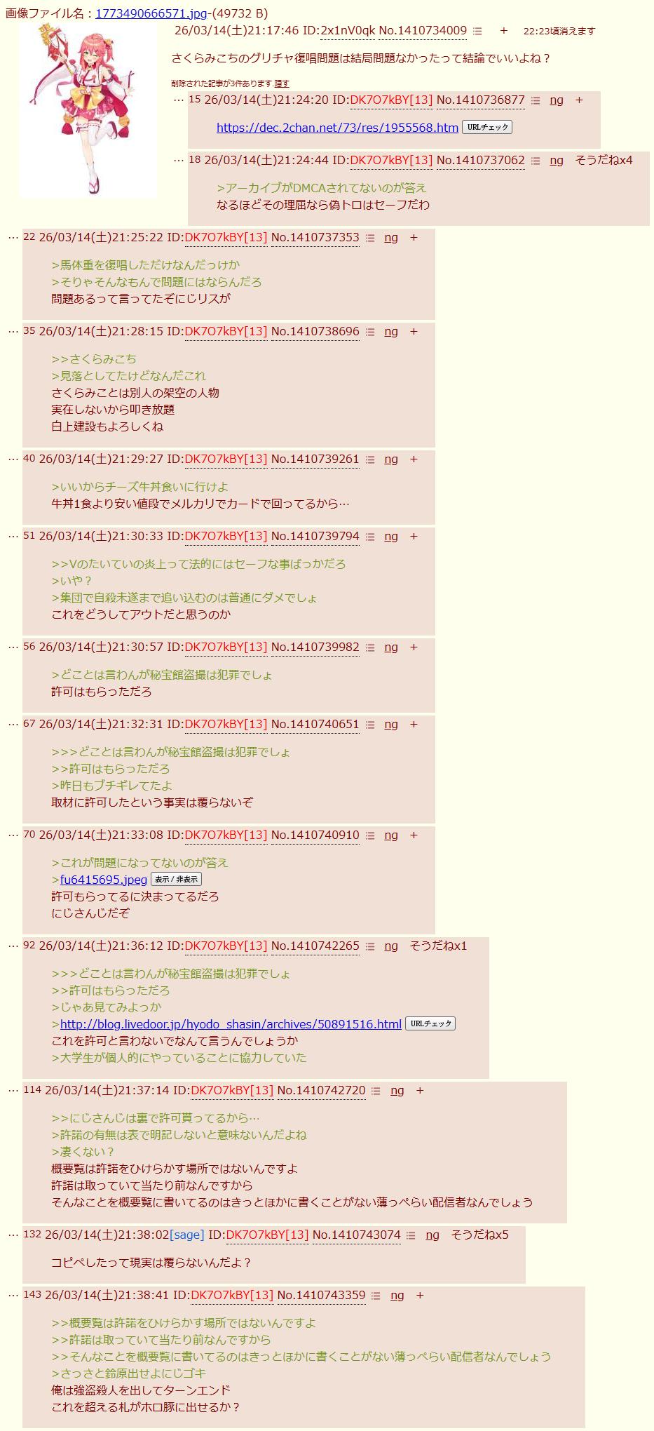 | … | 3026/03/14(土)21:27:38No.1410738397そうだねx7>>さくらみこちのグリチャ復唱問題は結局問題なかったって結論でいいよね? |